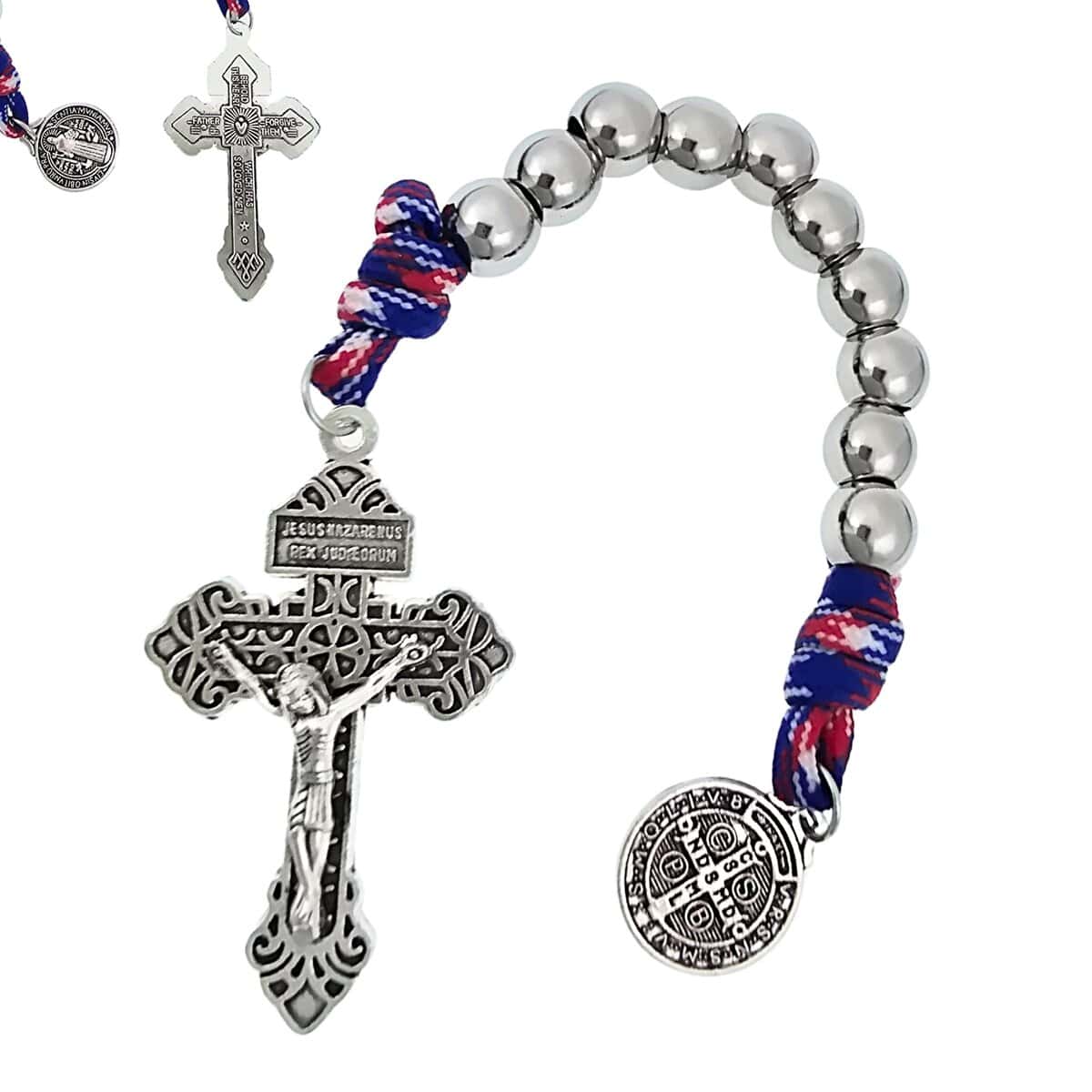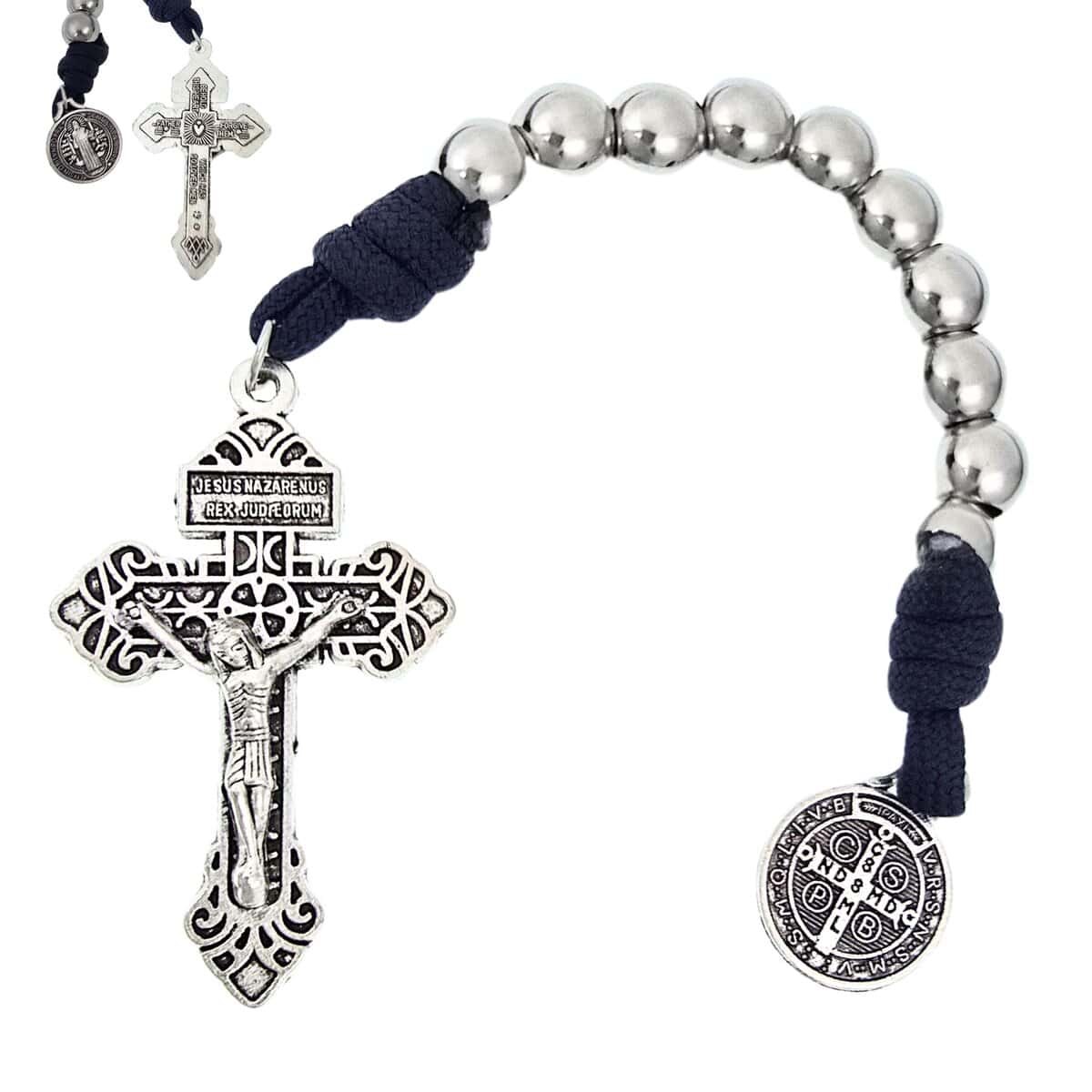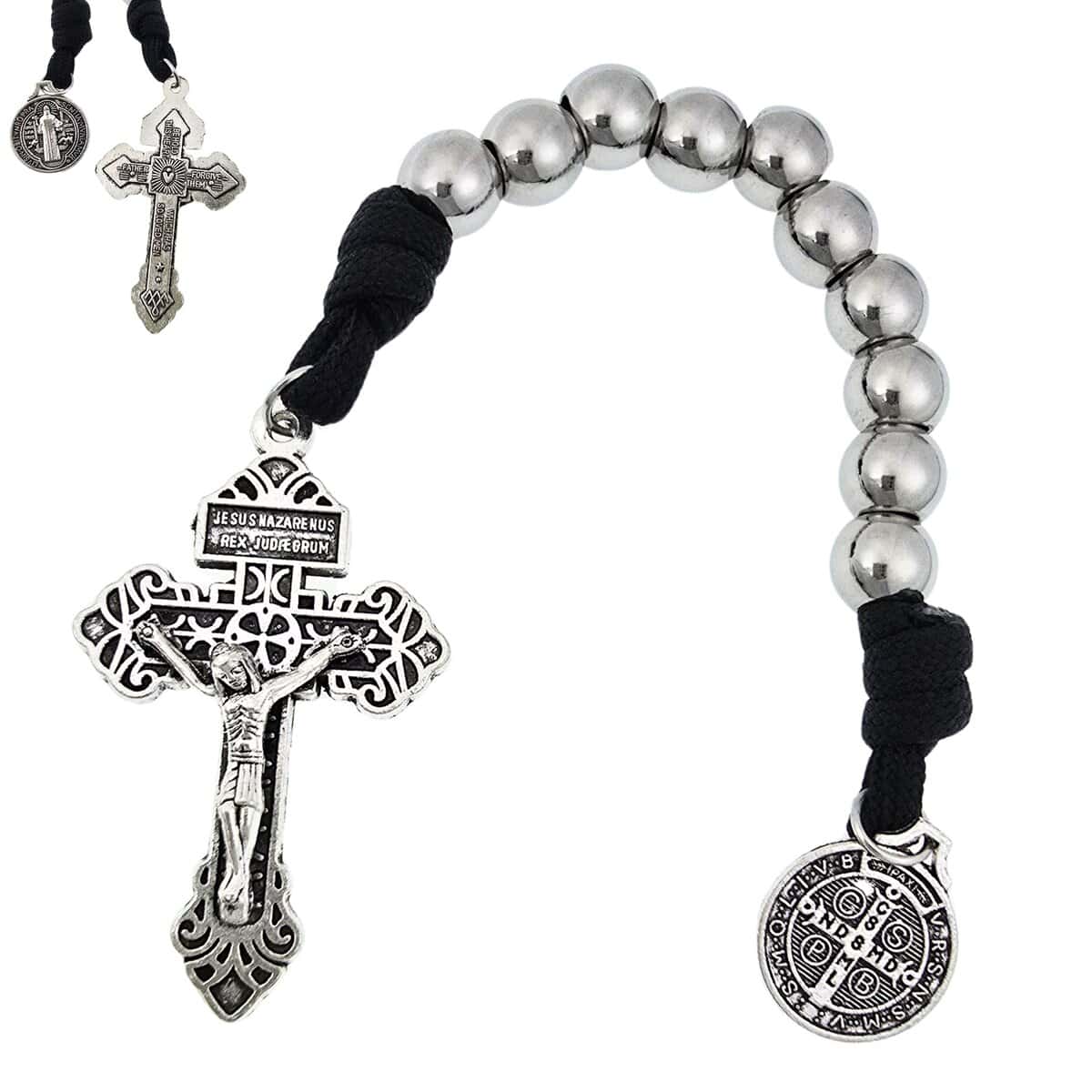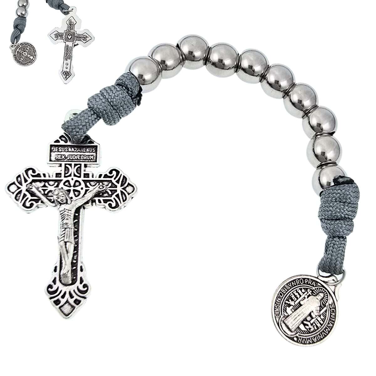 Cuentas de Acero Inoxidable, 10mmParacord GrisMedalla San Benito, 17.5mmCrucifijo, 5.5×3.5cm