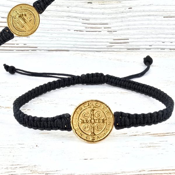 Medalla San Benito Chapa Oro, 12mmHilo negro tejido, ajustable